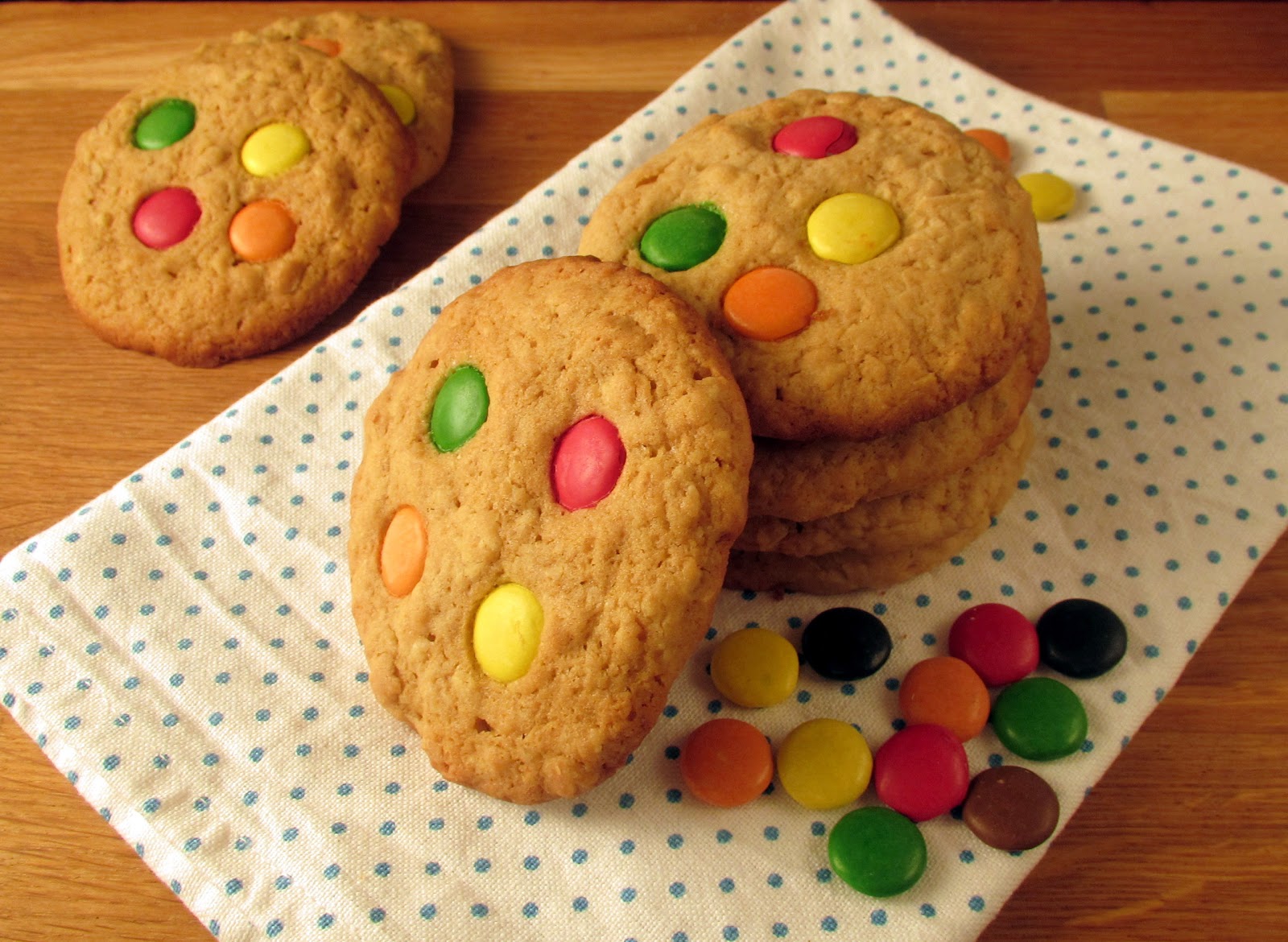 Place butter, brown sugar, eggs and in a bowl and mix with an electric mixer until smooth. Add flour, rolled oats, baking powder and salt, combine. Chill the dough in the fridge for 30 minutes before rolling. Roll into walnut sized portions. Flatten and decorate with M&M's. Bake for about 10 minutes. Longer if you want them more crunchy.